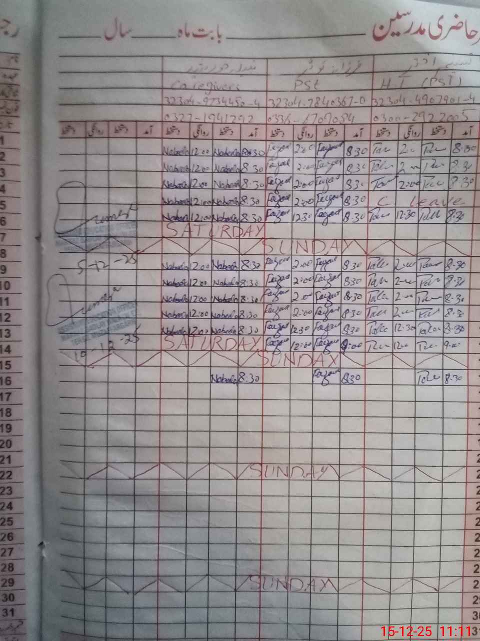 | CNIC | Full Name | Designation | R/C | Absence During Last Calender Month |
