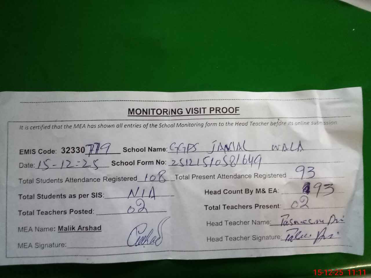 | Attendance Register | Head Teacher | MEA with School | Visit Proof |