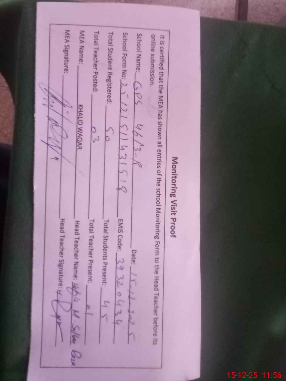 | Attendance Register | Head Teacher | MEA with School | Visit Proof |