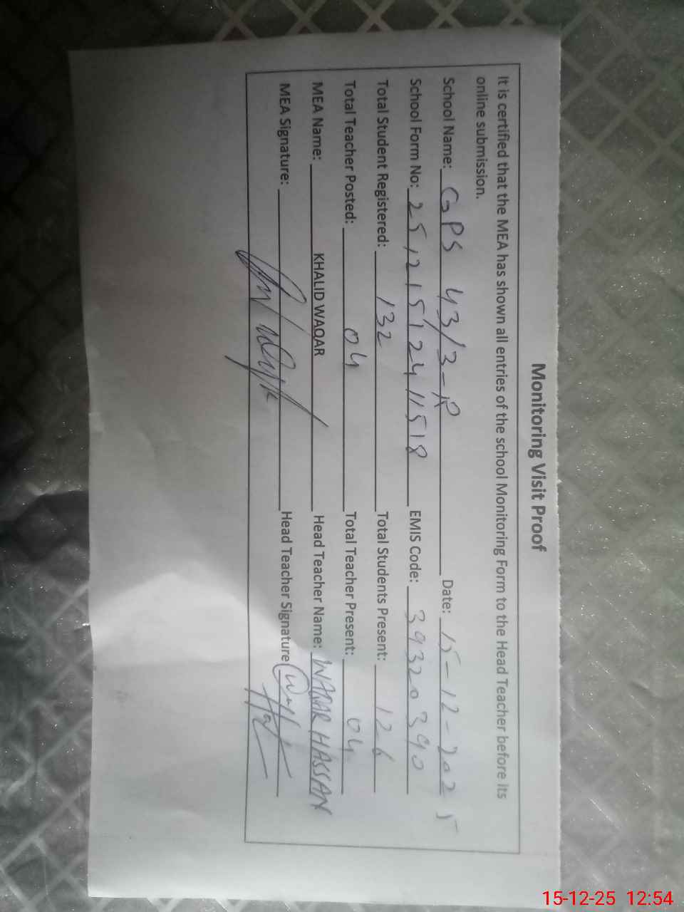 | Attendance Register | Head Teacher | MEA with School | Visit Proof |