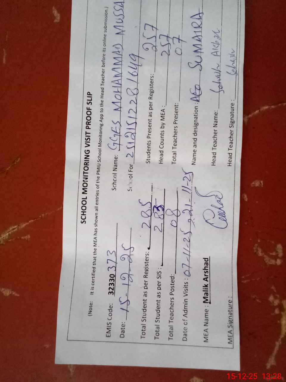| Attendance Register | Head Teacher | MEA with School | Visit Proof |