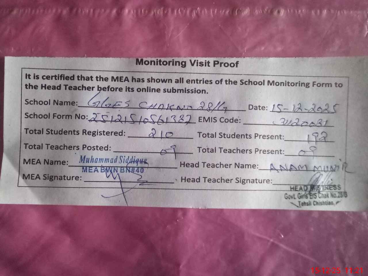 | EMIS Code: 31120081 | Name of School: GGES CHAK NO. 28/G | |||