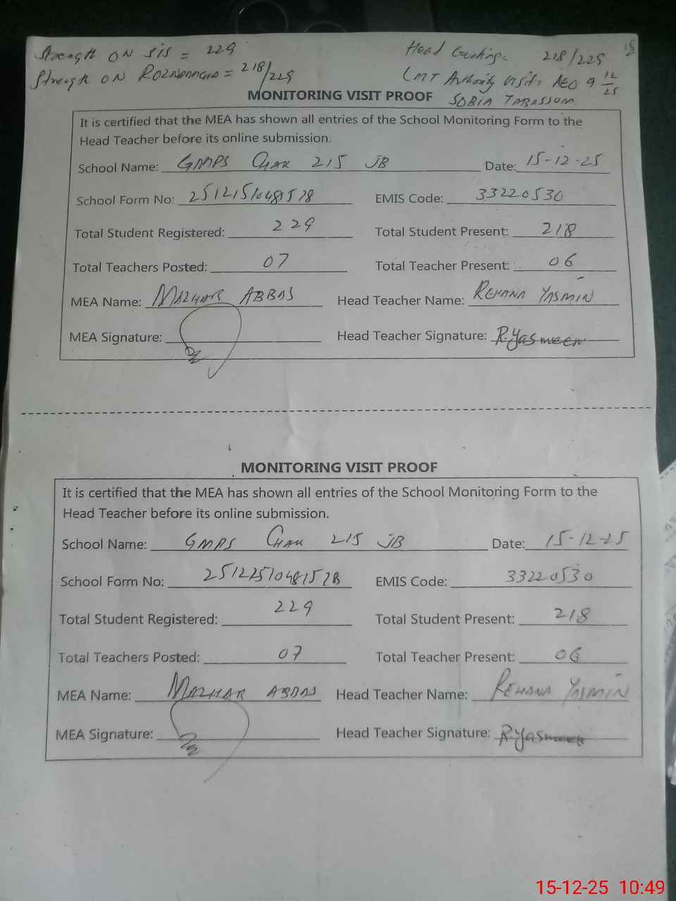 | Attendance Register | Head Teacher | MEA with School | Visit Proof |