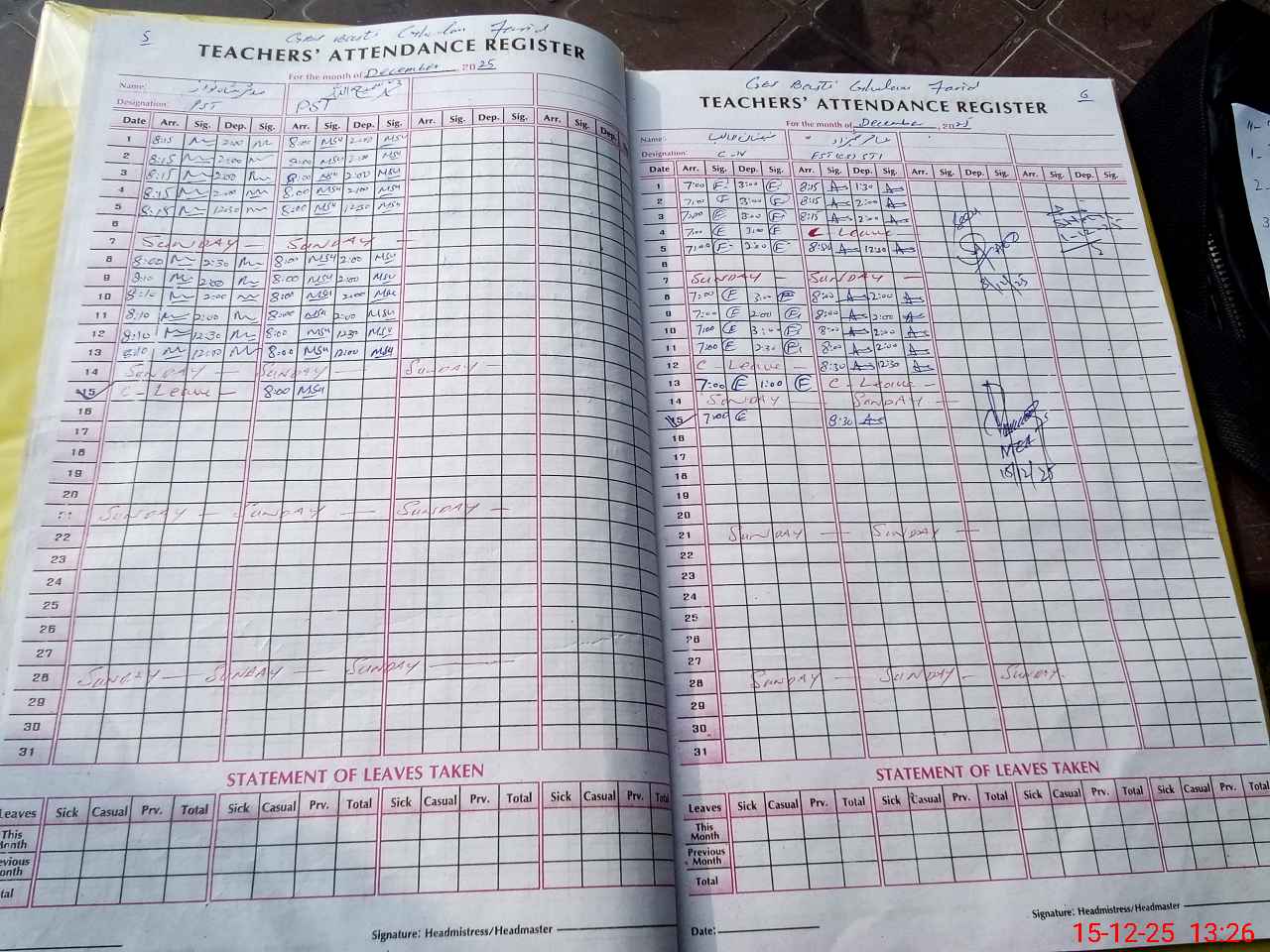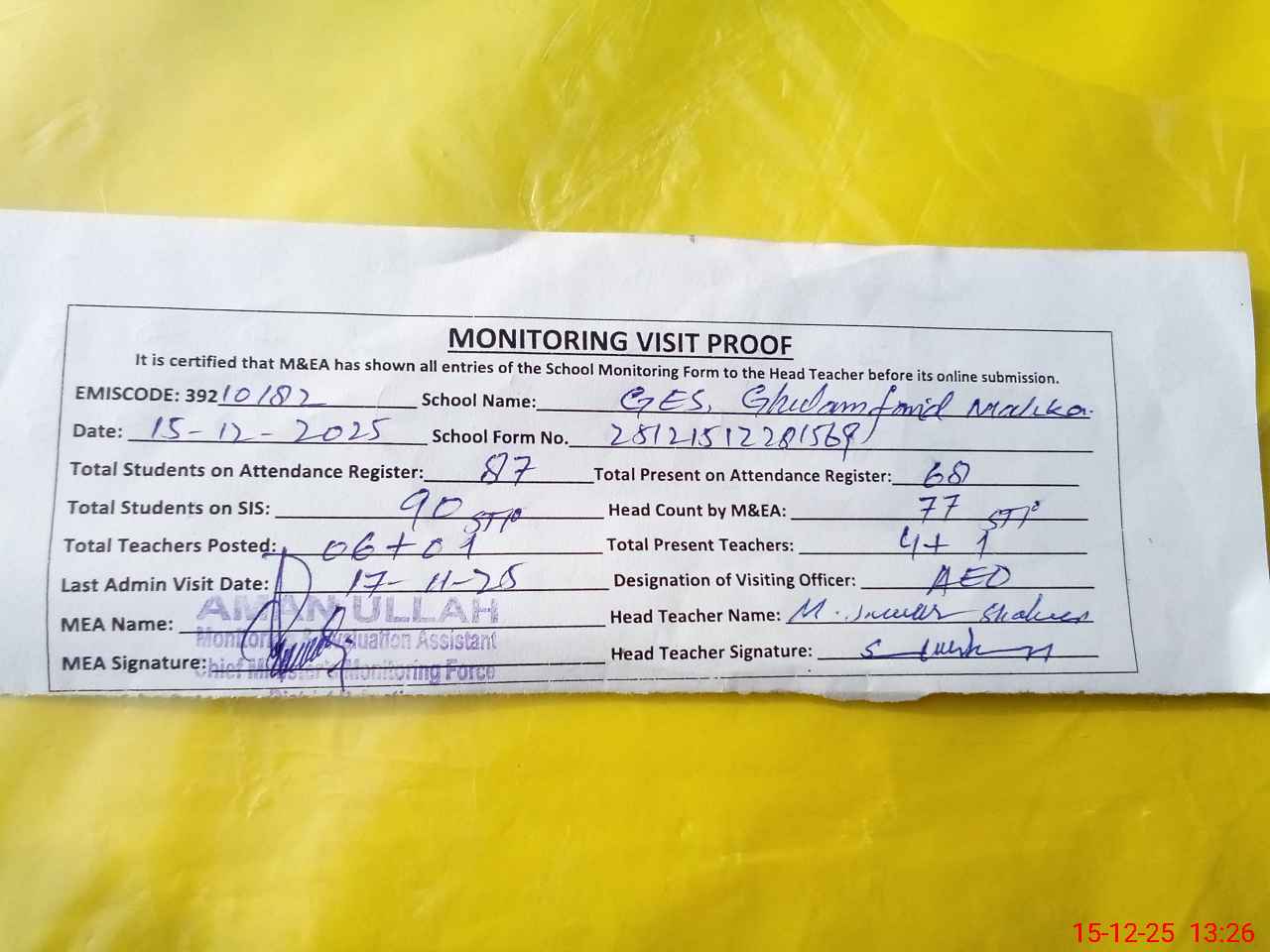 | Attendance Register | Head Teacher | MEA with School | Visit Proof |