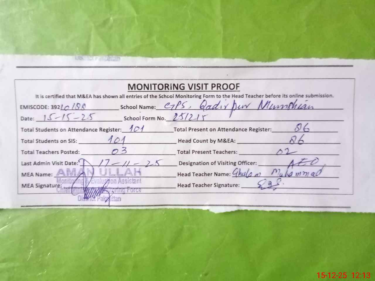 | Attendance Register | Head Teacher | MEA with School | Visit Proof |