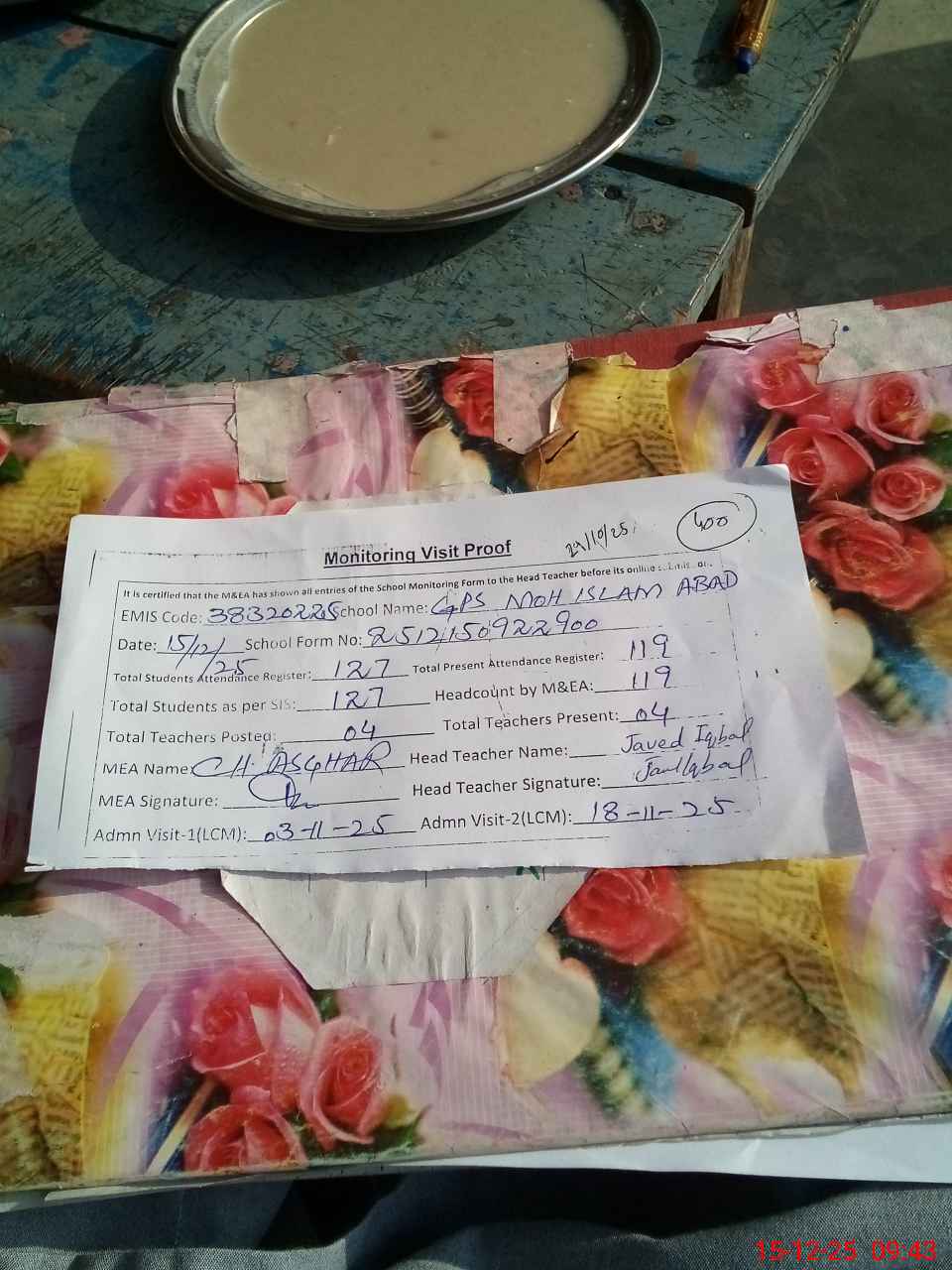 | Attendance Register | Head Teacher | MEA with School | Visit Proof |