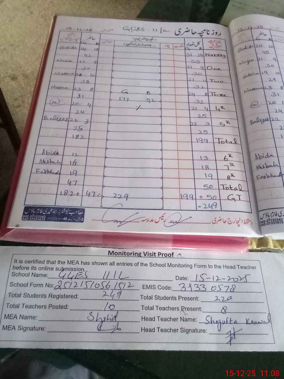 | Attendance Register | Head Teacher | MEA with School | Visit Proof |