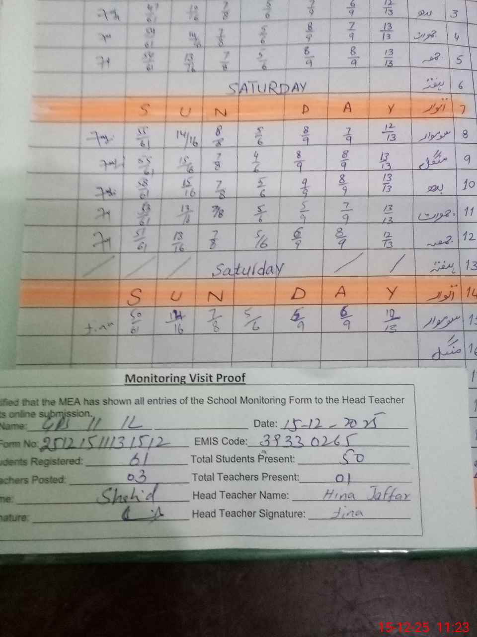 | Attendance Register | Head Teacher | MEA with School | Visit Proof |