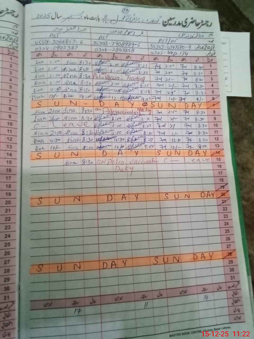 | CNIC | Full Name | Designation | R/C | Absence During Last Calender Month |
