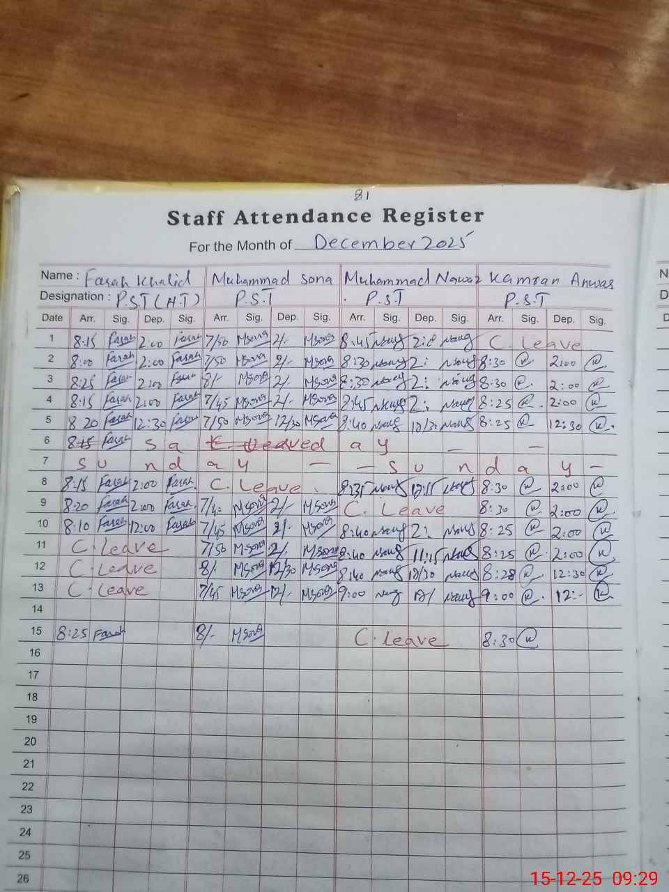 | CNIC | Full Name | Designation | R/C | Absence During Last Calender Month |