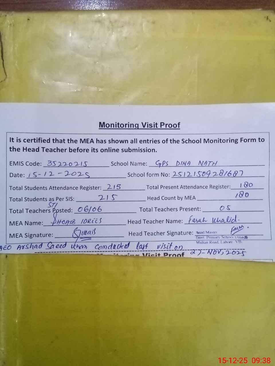 | Attendance Register | Head Teacher | MEA with School | Visit Proof |