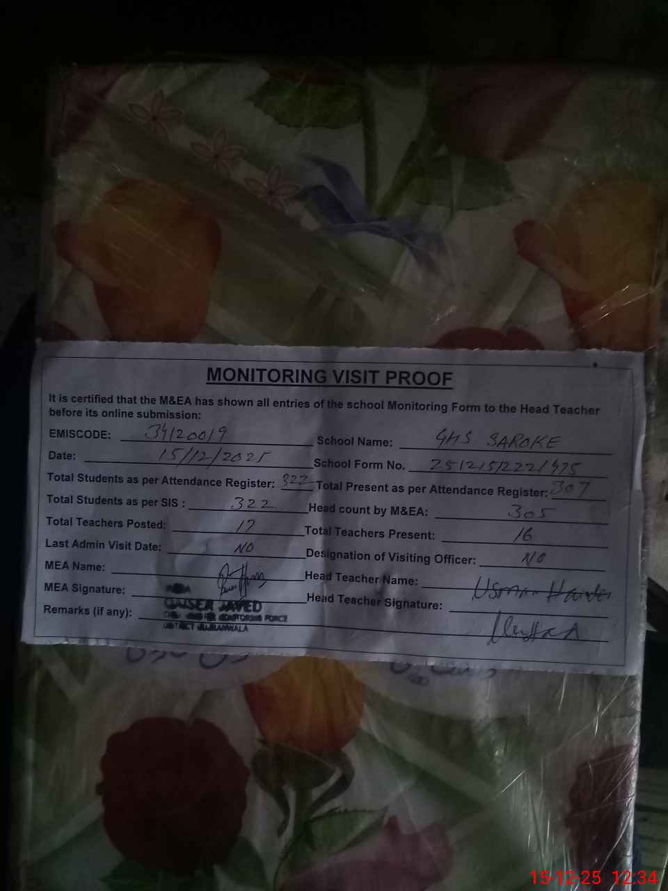 | Attendance Register | Head Teacher | MEA with School | Visit Proof |