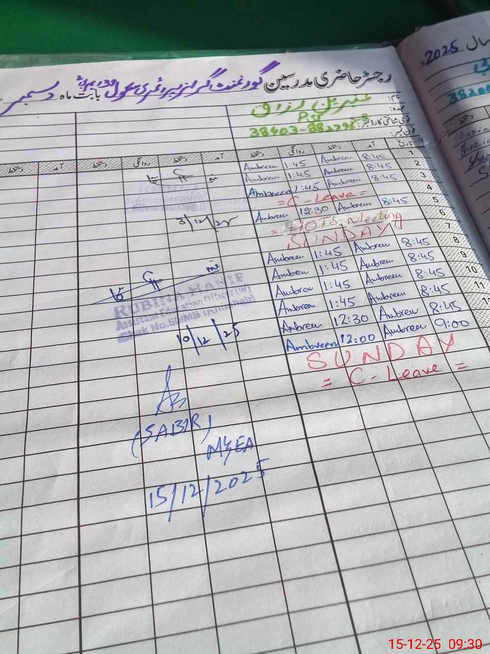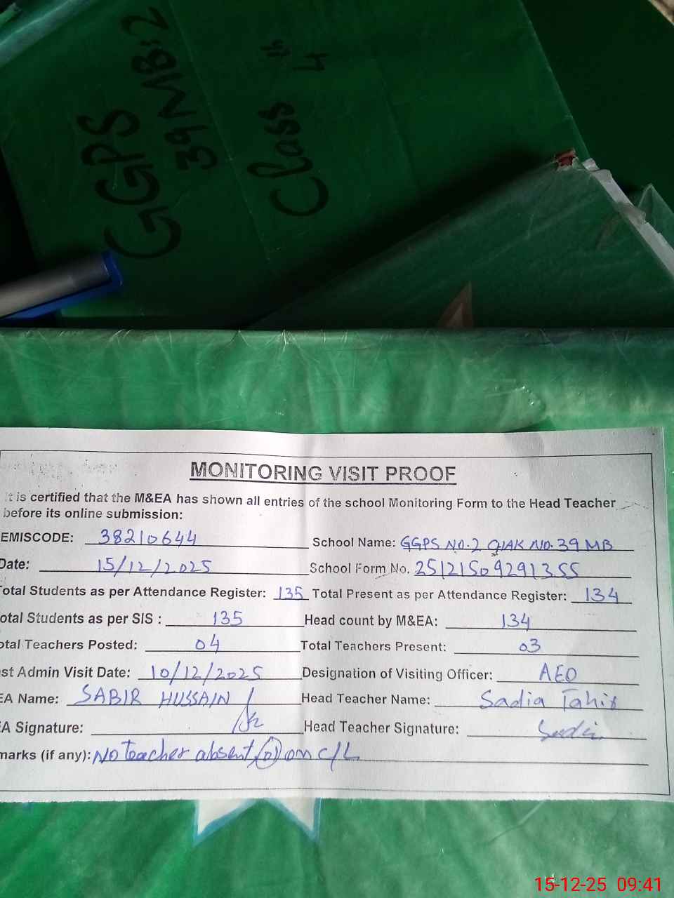 | Remarks (Use Separate Page if Required): no teacher absent total students on register 135 total students on SiS 135 present students are 134 last admin visit by AEO on 10 Dec 2025 | |||||