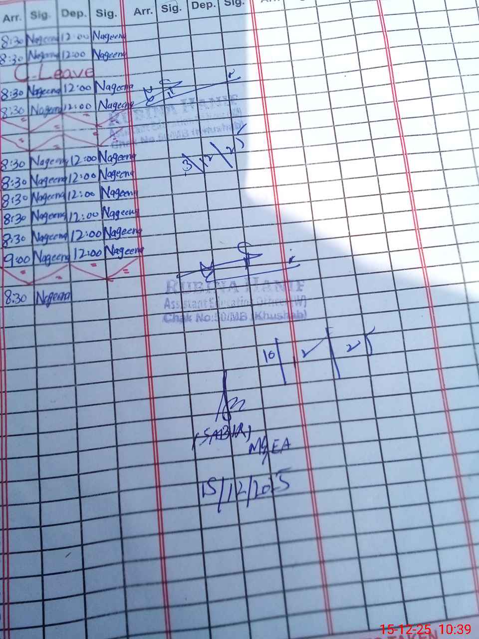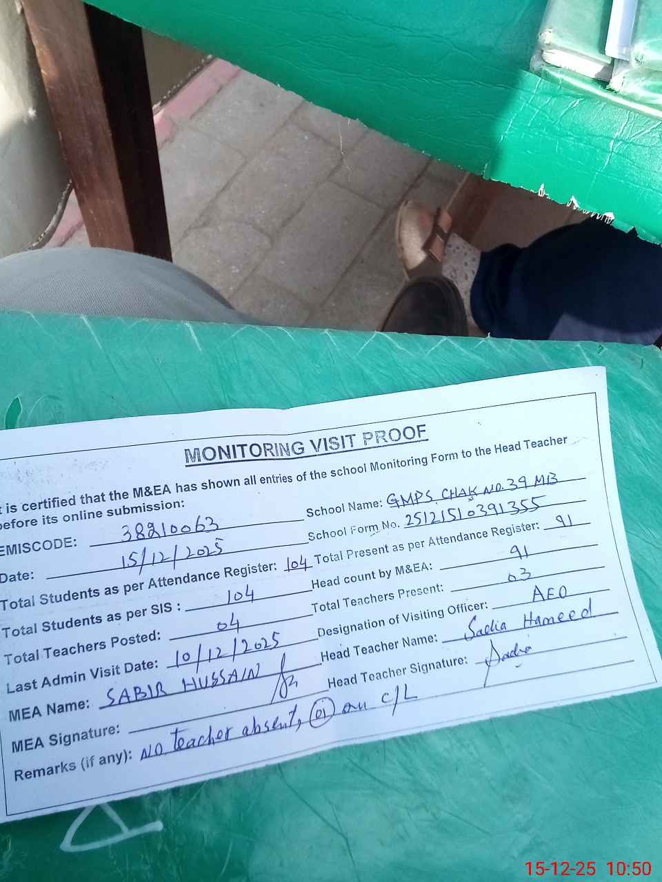 | Remarks (Use Separate Page if Required): no teacher absent total students on register 104 total students on SiS 104 present students are 91 last admin visit by AEO on 10 Dec 2025 | |||||