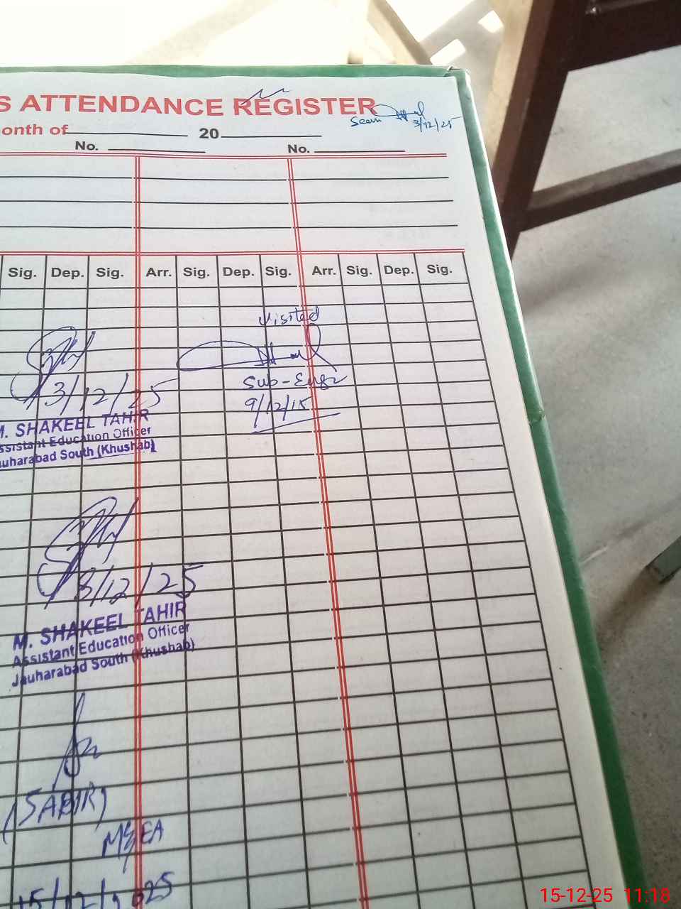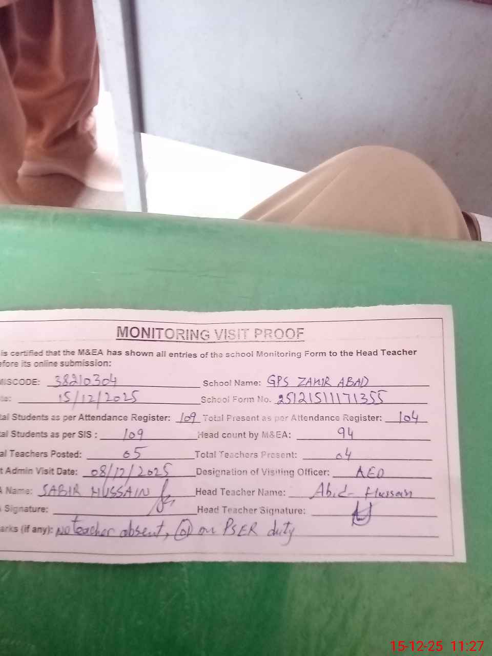 | Remarks (Use Separate Page if Required): no teacher absent Total students on register 109 total students on SiS 109 present students are 94 last admin visit by AEO on 08 Dec 2025 | |||||