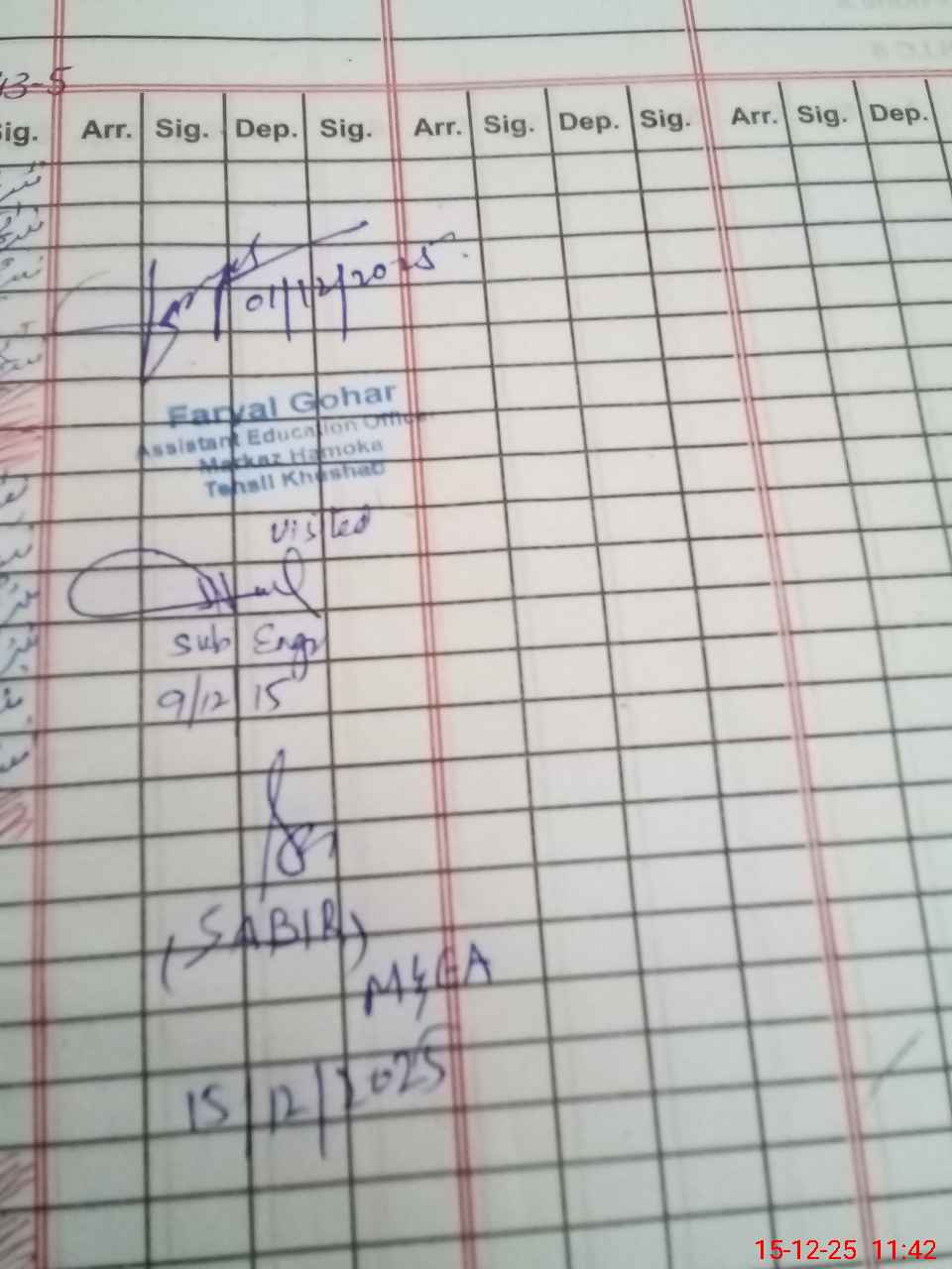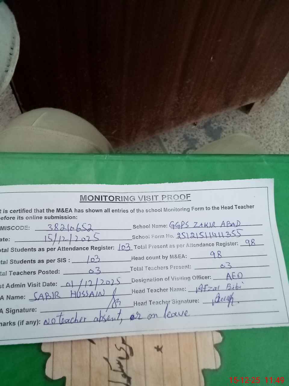 | Remarks (Use Separate Page if Required): no teacher absent total students on register 103 total students on SiS 193 present students are 98 last admin visit by AEO on 01 Dec 2025 | |||||