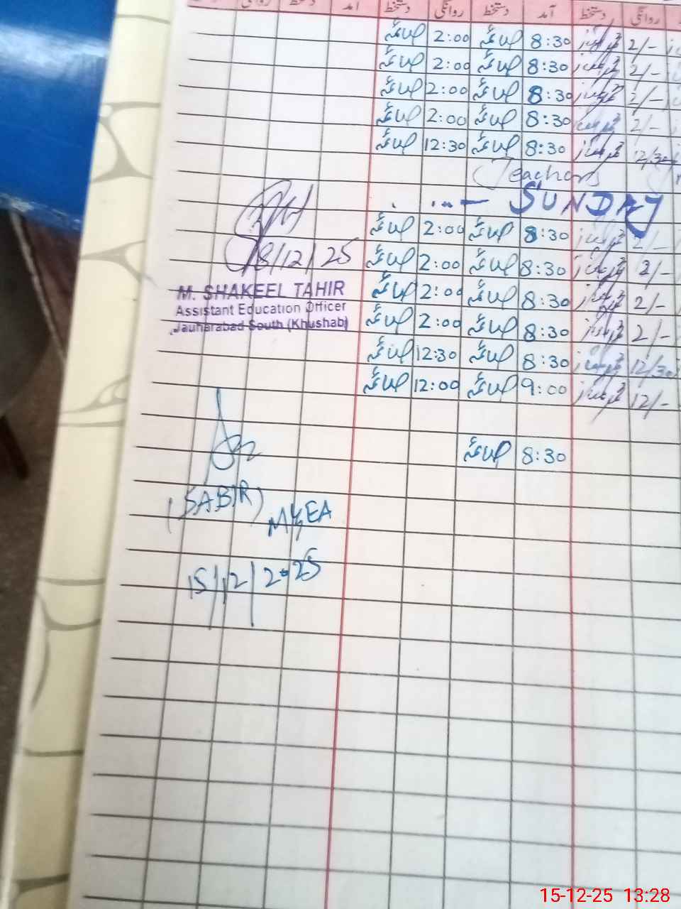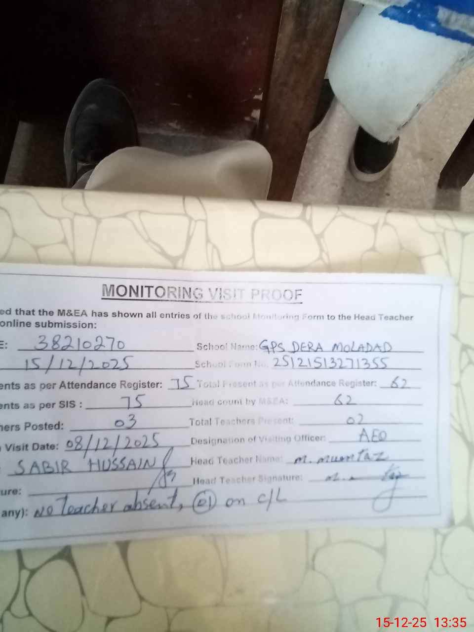 | Remarks (Use Separate Page if Required): no teacher absent total students on register 75 total students on SiS 75 present students are 62 last admin visit by AEO on 08 Dec 2025 | |||||