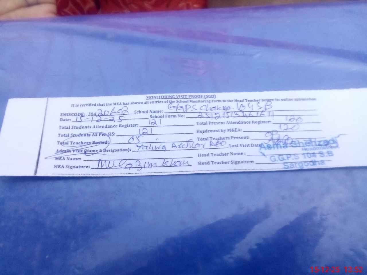 | EMIS Code: 38420602 | Name of School: GGPS CHAK NO.104 SB | |||