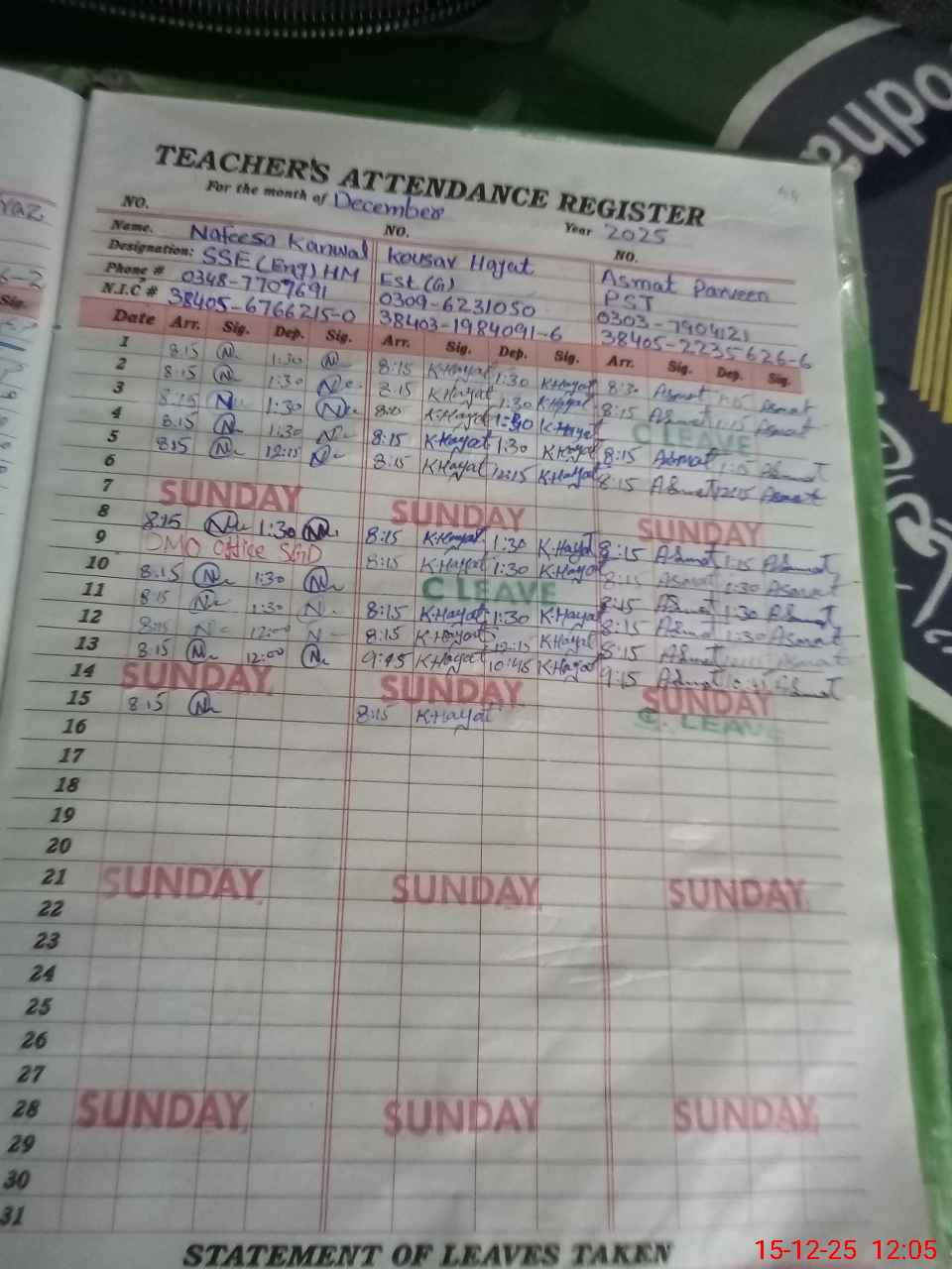 | CNIC | Full Name | Designation | R/C | Absence during last cal. month |