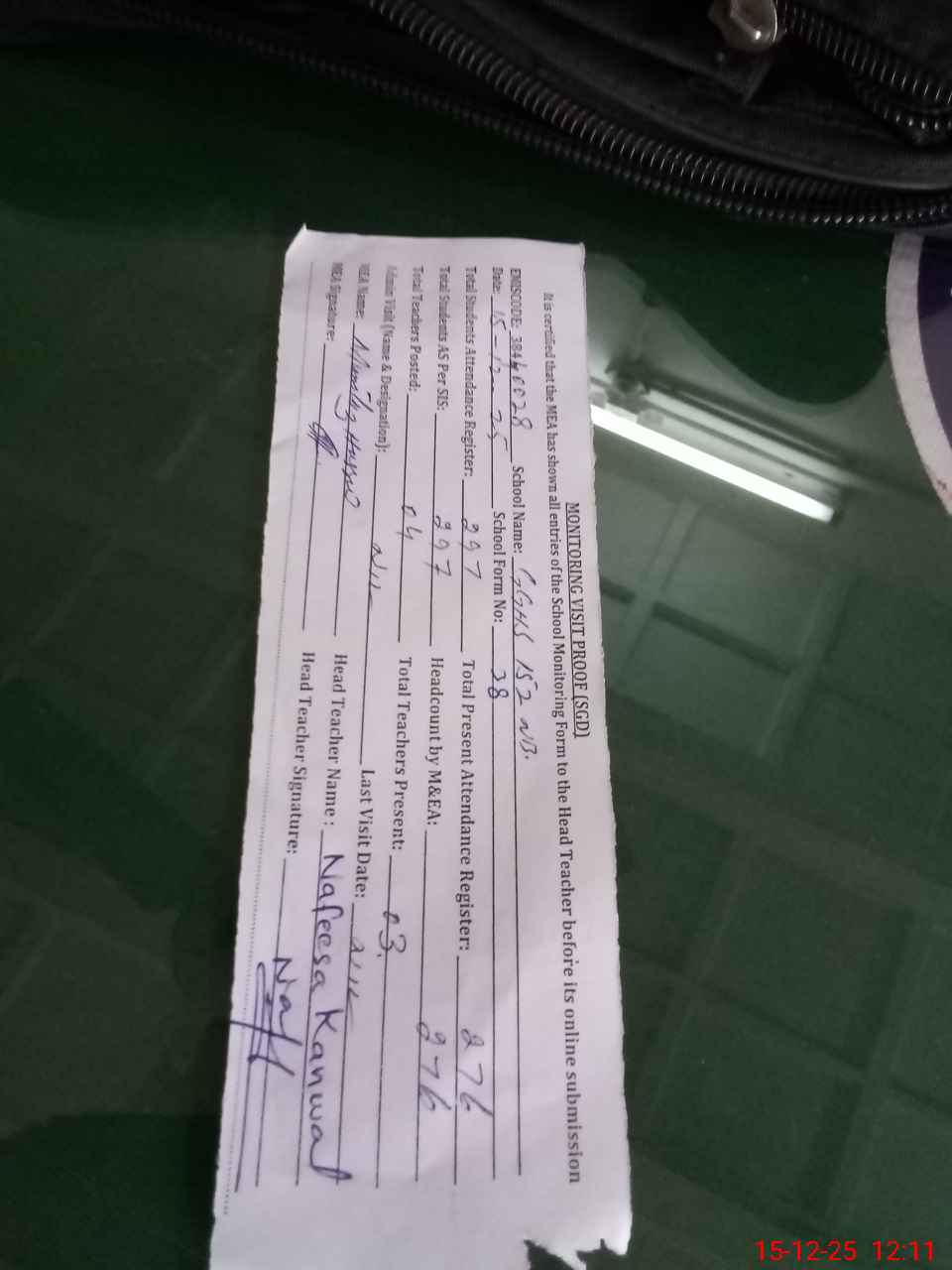| Attendance Register | Head Teacher | MEA with School | Visit Proof |