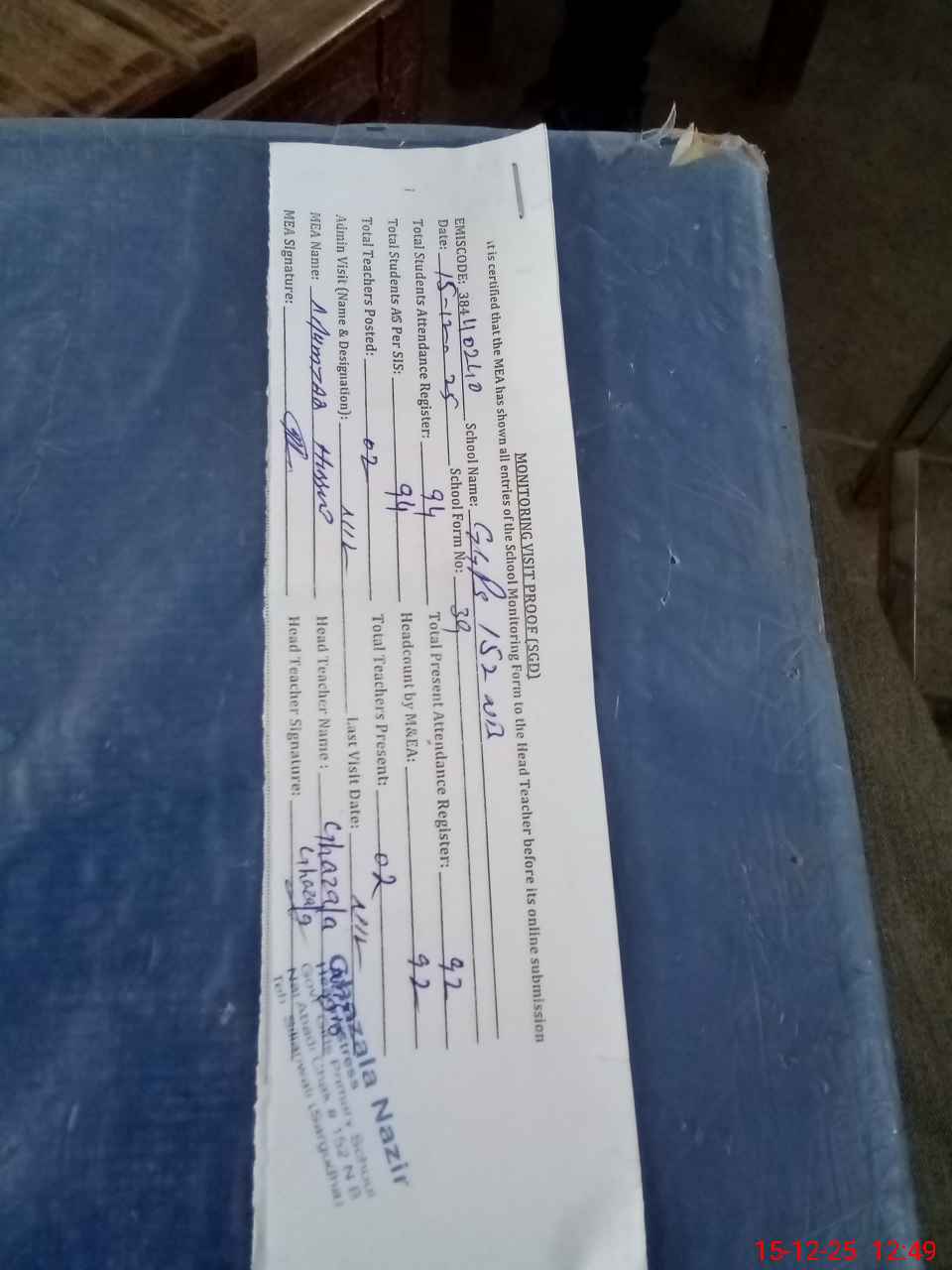 | Attendance Register | Head Teacher | MEA with School | Visit Proof |