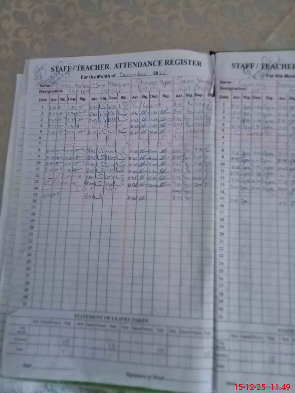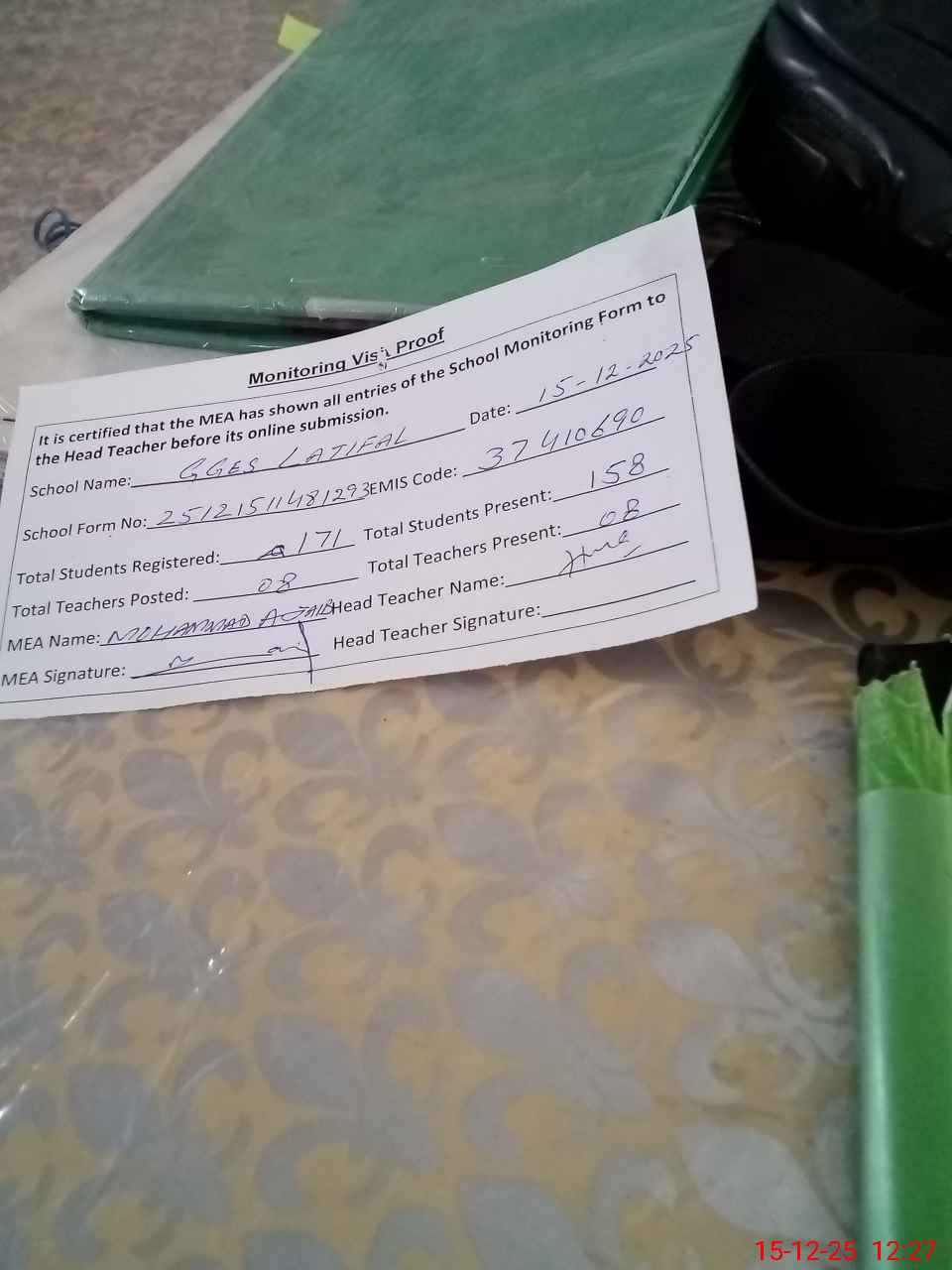 | Attendance Register | Head Teacher | MEA with School | Visit Proof |
