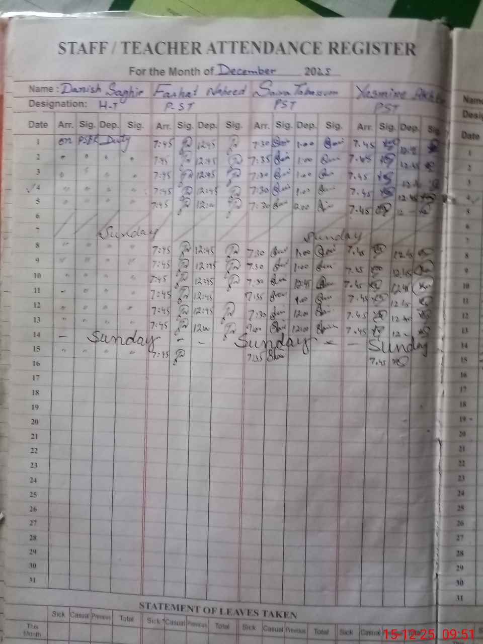 | 37**** | An**** Sh**** | PST Science/Maths | Regular | 0 | 0 | 0 | 0 | 0 | 0 | 0 | 0 | 0 | Maternity |