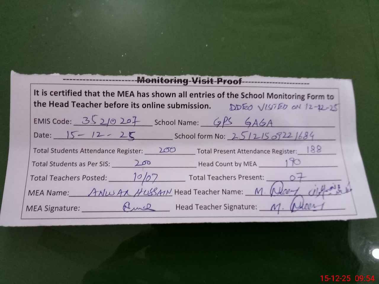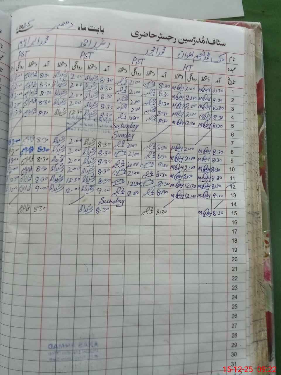 | Remarks (Use Separate Page if Required): 02 class Room floor broken DDEO Visited on 12 December 2025 Muhammad Bilal Habib SG as per attendance register on casual leave but sanctioned leave not available so Mark absent 35210207 | |||||
