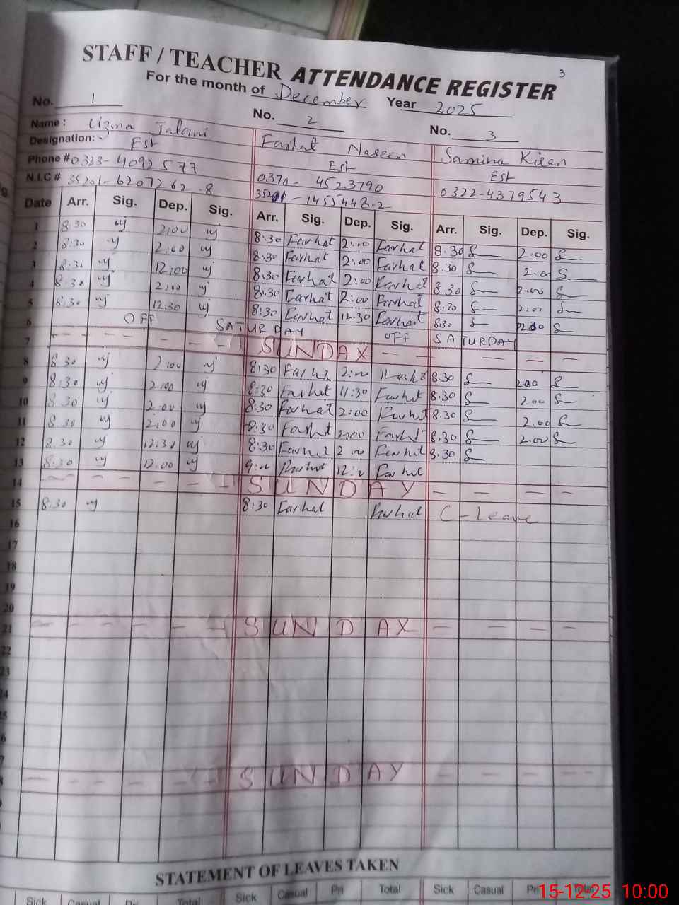 | CNIC | Full Name | Designation | R/C | Absence During Last Calender Month |