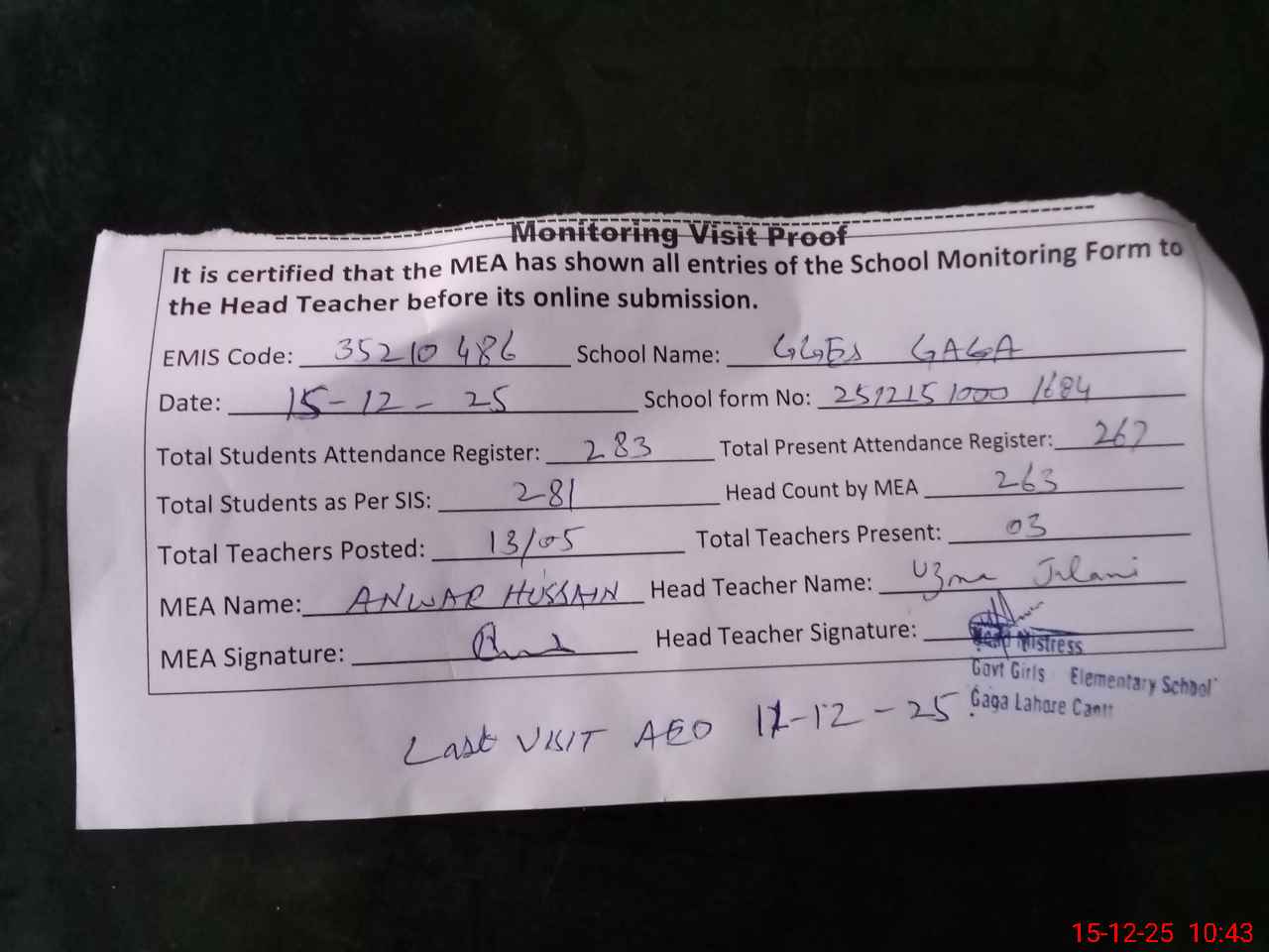 | Attendance Register | Head Teacher | MEA with School | Visit Proof |