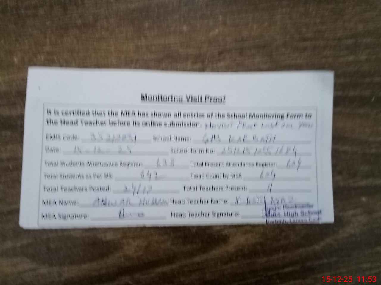 | Attendance Register | Head Teacher | MEA with School | Visit Proof |