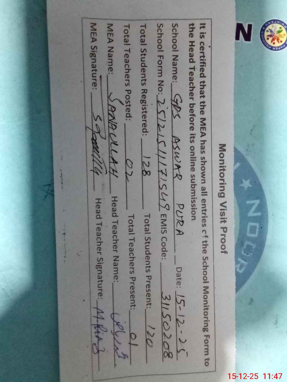 | EMIS Code: 31150208 | Name of School: GPS ASWAR PURA | |||