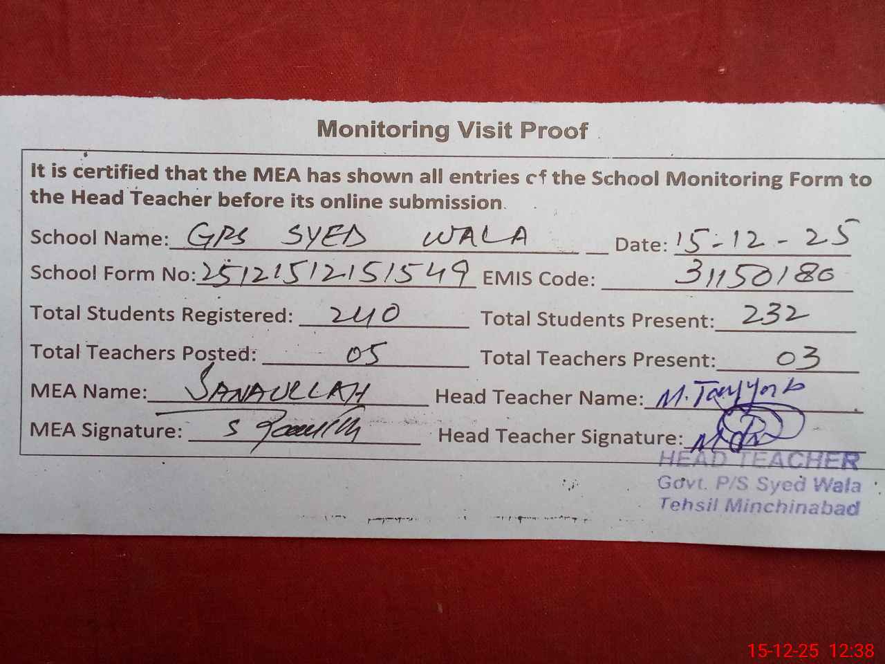| Attendance Register | Head Teacher | MEA with School | Visit Proof |