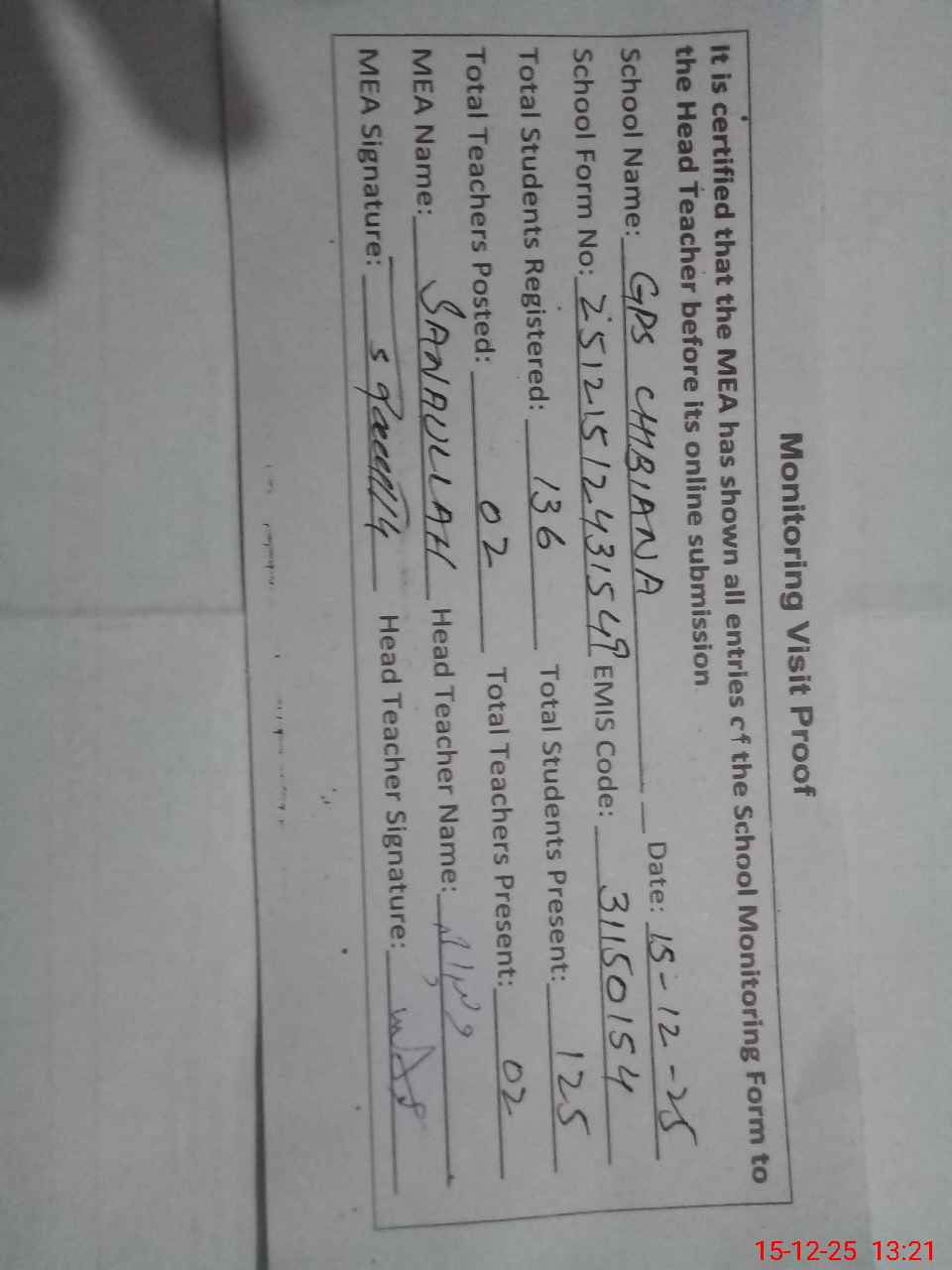 | Attendance Register | Head Teacher | MEA with School | Visit Proof |