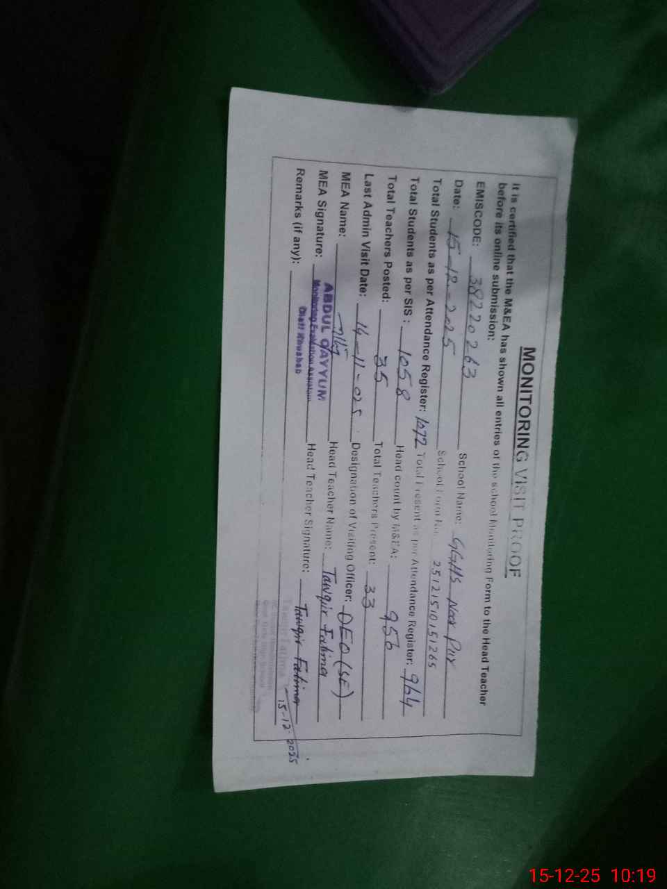 | Certified that this School was Inspected by the Undersigned MEA/DMO Today and the Information Stated Above is as Per Record. | |||||