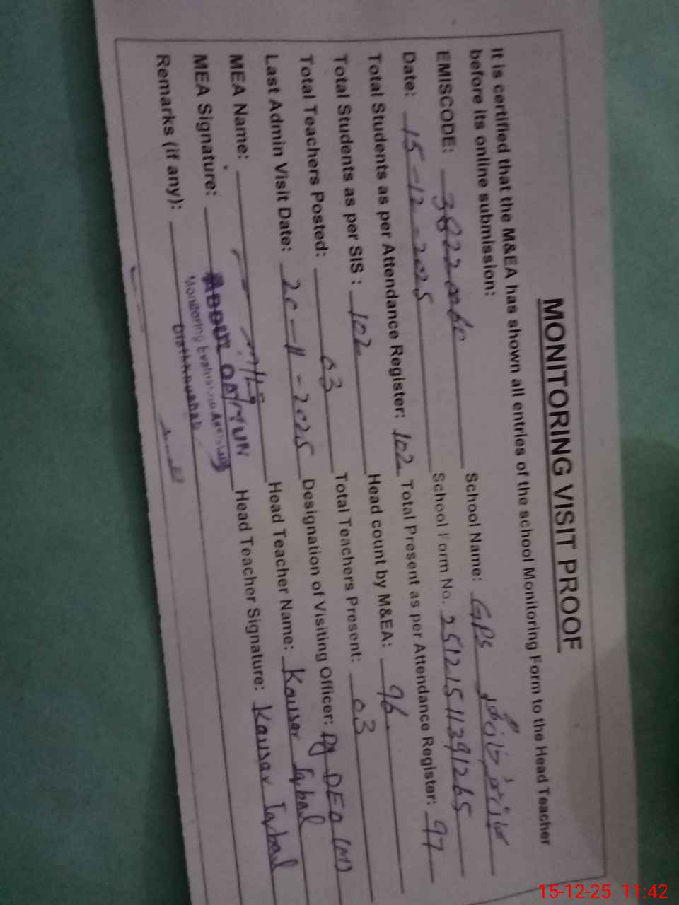 | Attendance Register | Head Teacher | MEA with School | Visit Proof |