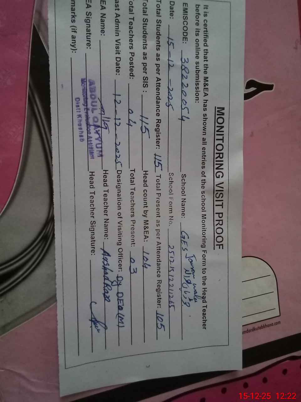 | Attendance Register | Head Teacher | MEA with School | Visit Proof |