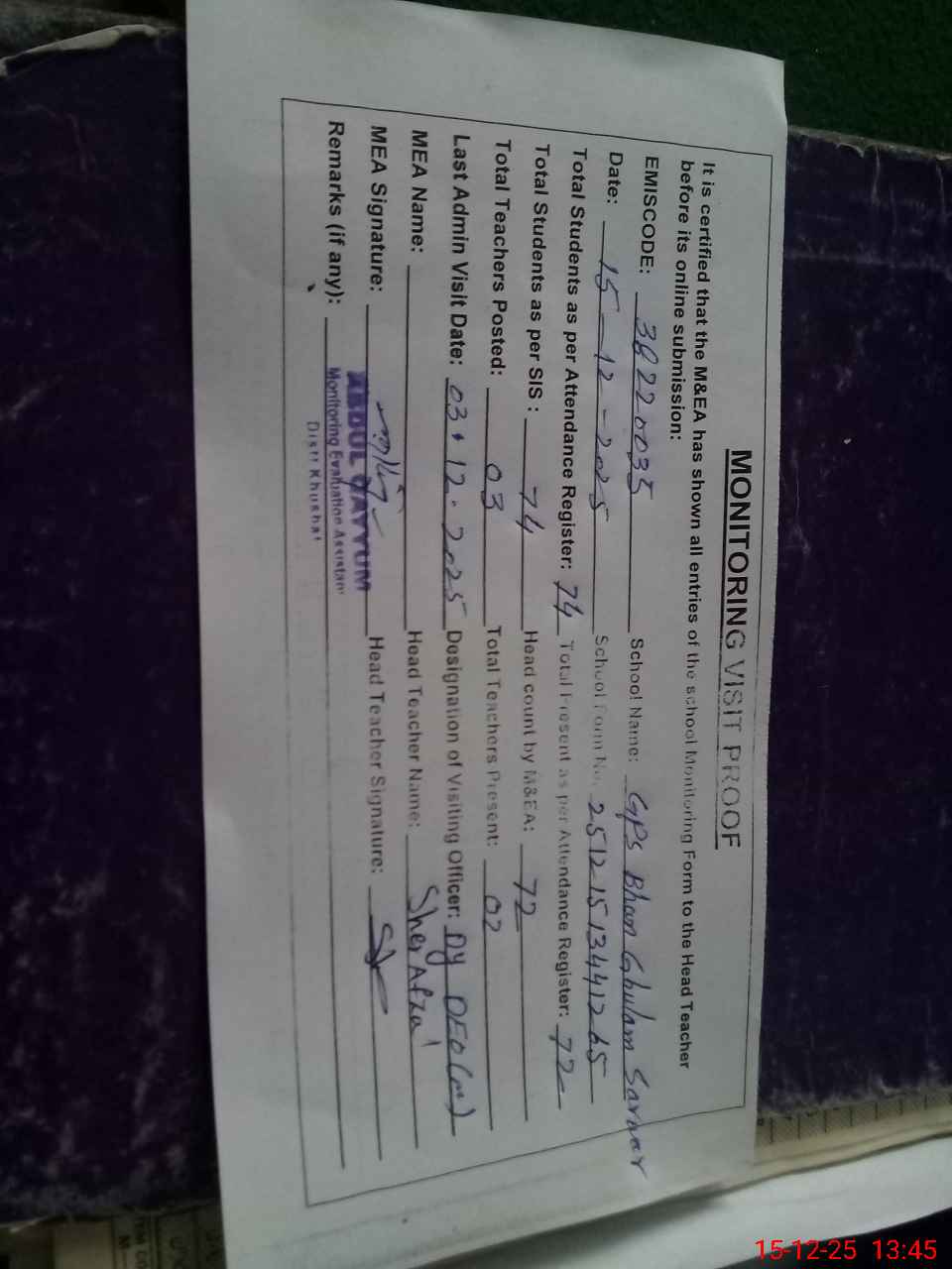 | EMIS Code: 38220035 | Name of School: GPS BHAN GHULAM SARWAR | |||