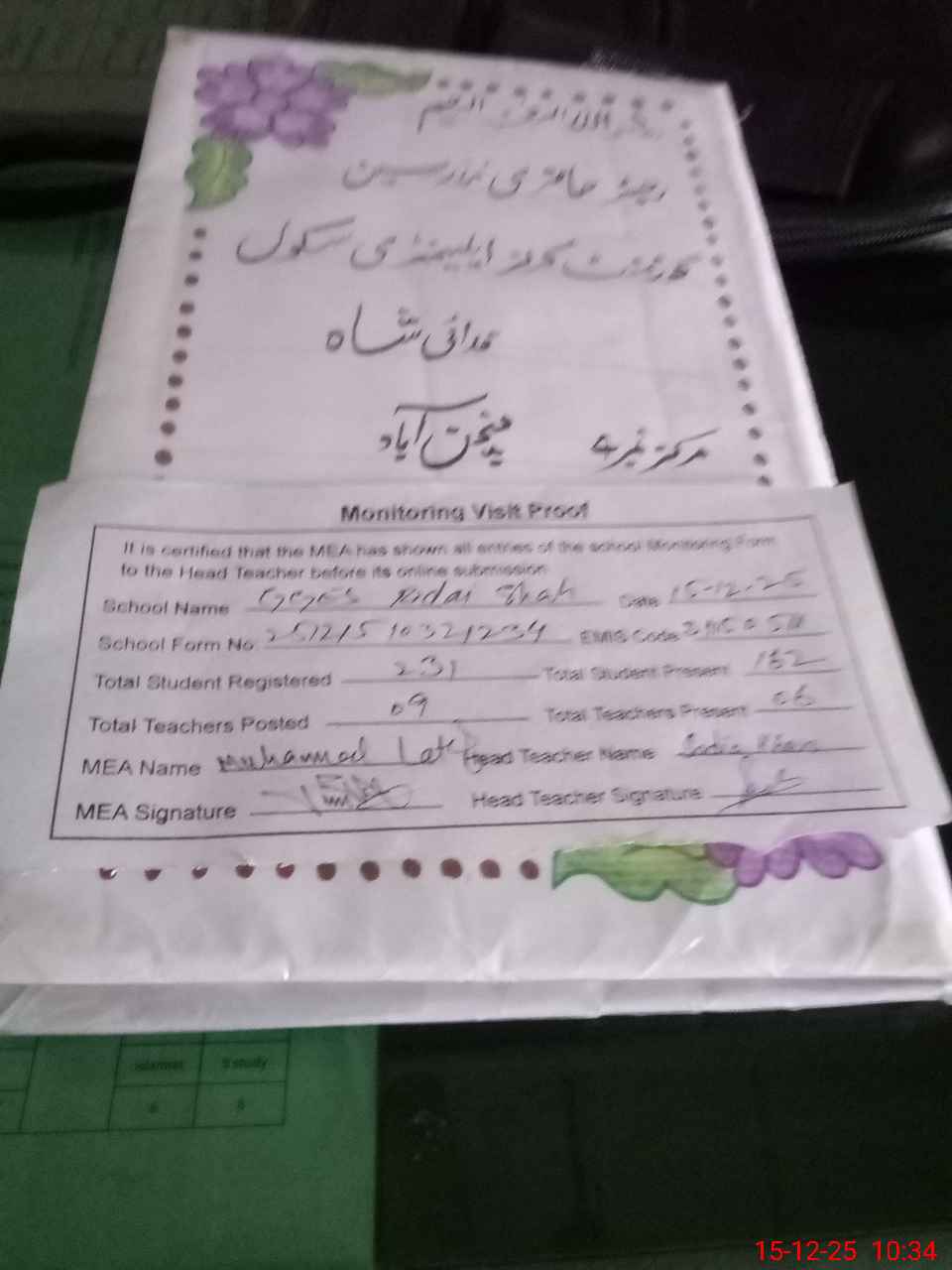 | Attendance Register | Head Teacher | MEA with School | Visit Proof |