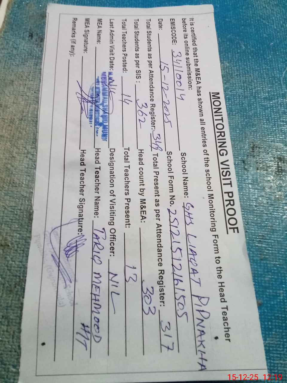 | EMIS Code: 34110014 | Name of School: GHS LIAQAT PIPNAKHA | |||