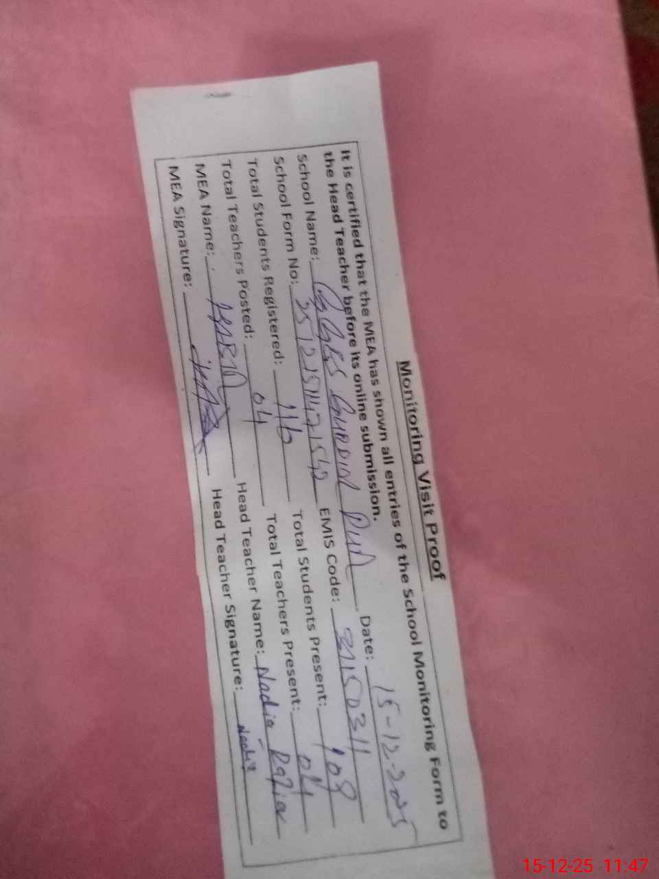 | Certified that this School was Inspected by the Undersigned MEA/DMO Today and the Information Stated Above is as Per Record. | |||||