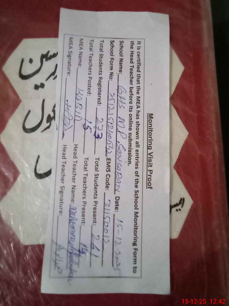 | Attendance Register | Head Teacher | MEA with School | Visit Proof |
