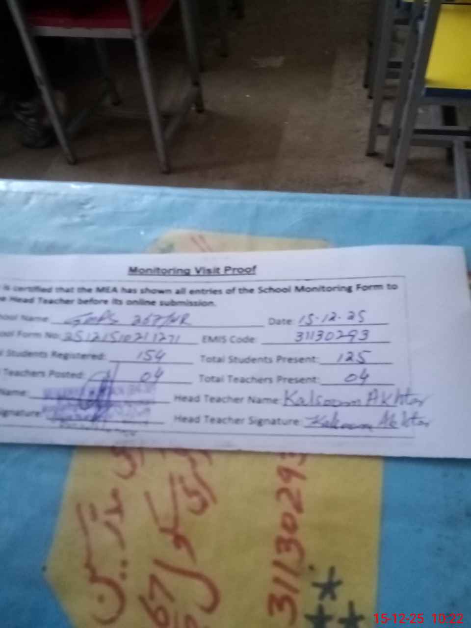 | Attendance Register | Head Teacher | MEA with School | Visit Proof |