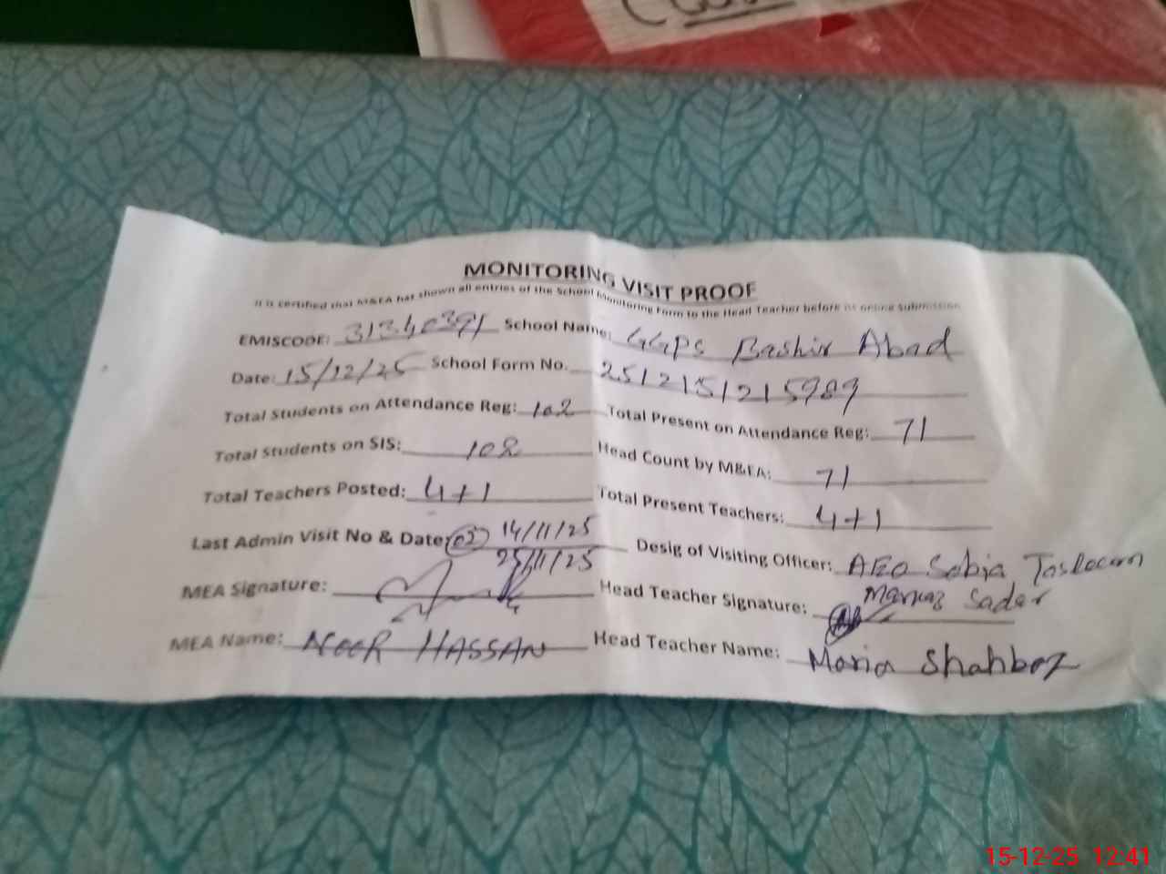 | EMIS Code: 31340391 | Name of School: GGPS BASHIR ABAD | |||