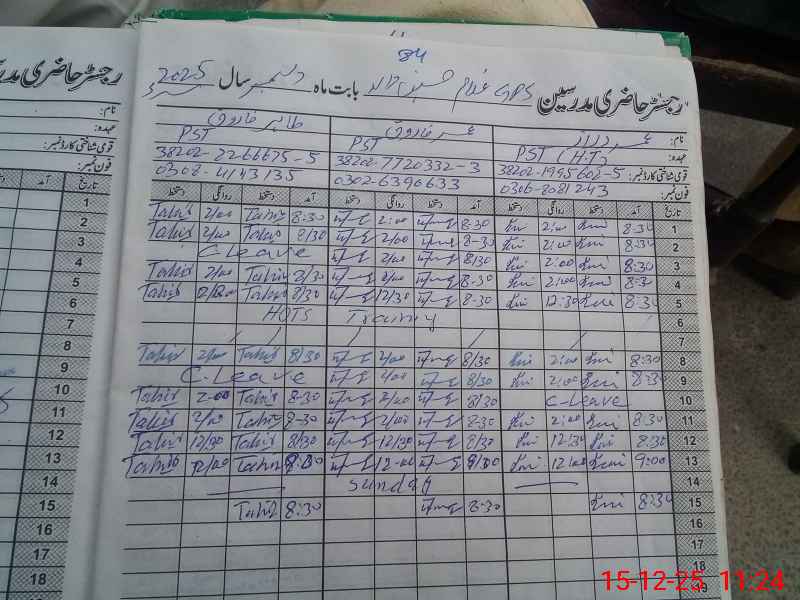 | CNIC | Full Name | Designation | R/C | Absence During Last Calender Month |