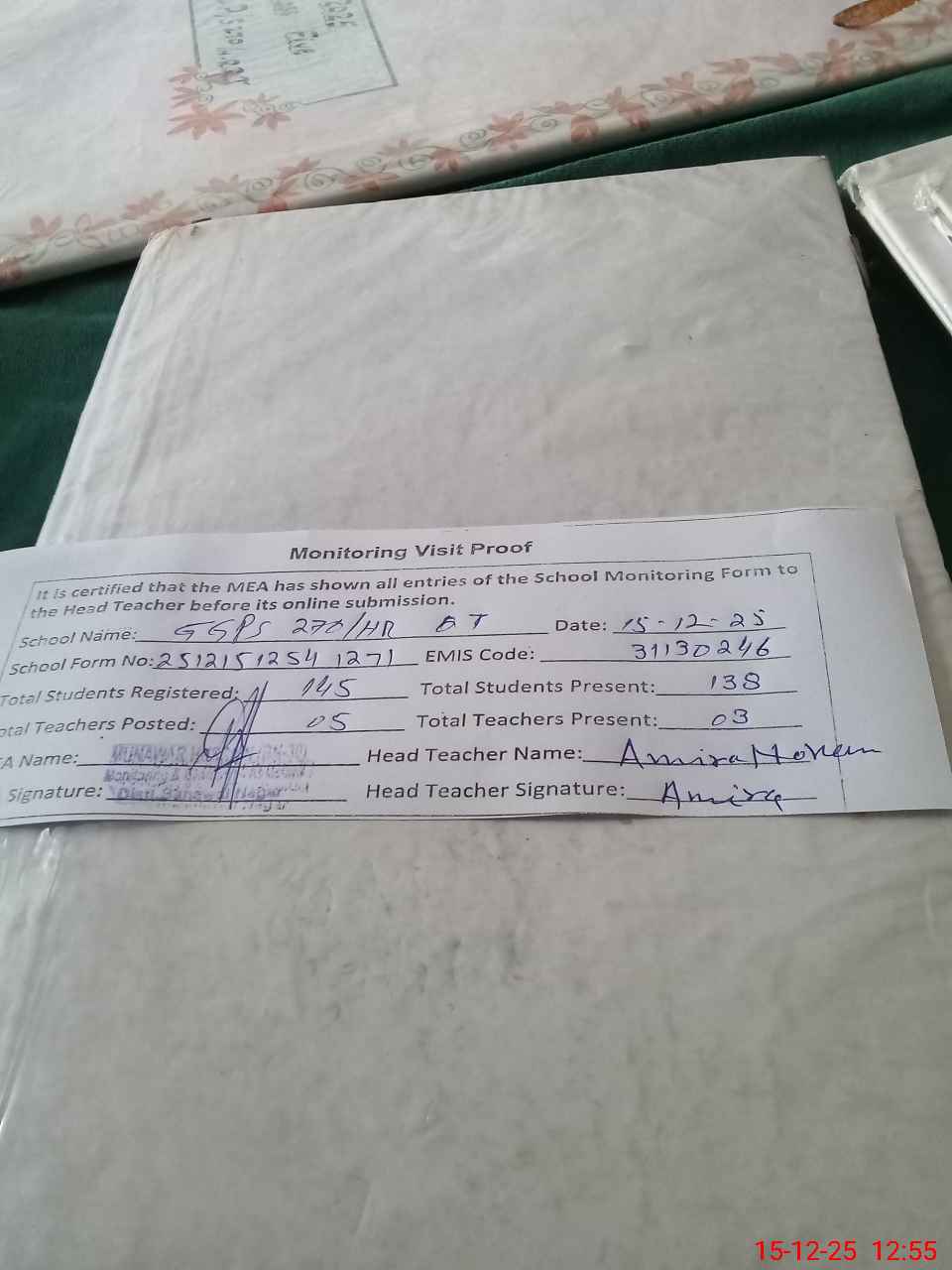 | Attendance Register | Head Teacher | MEA with School | Visit Proof |