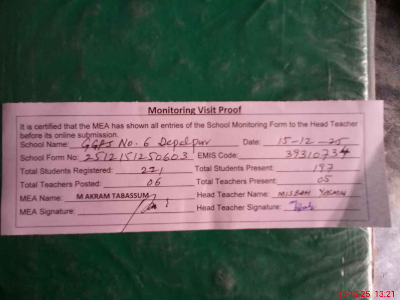 | EMIS Code: 39310734 | Name of School: GGPS NO.6 DEPALPUR | |||