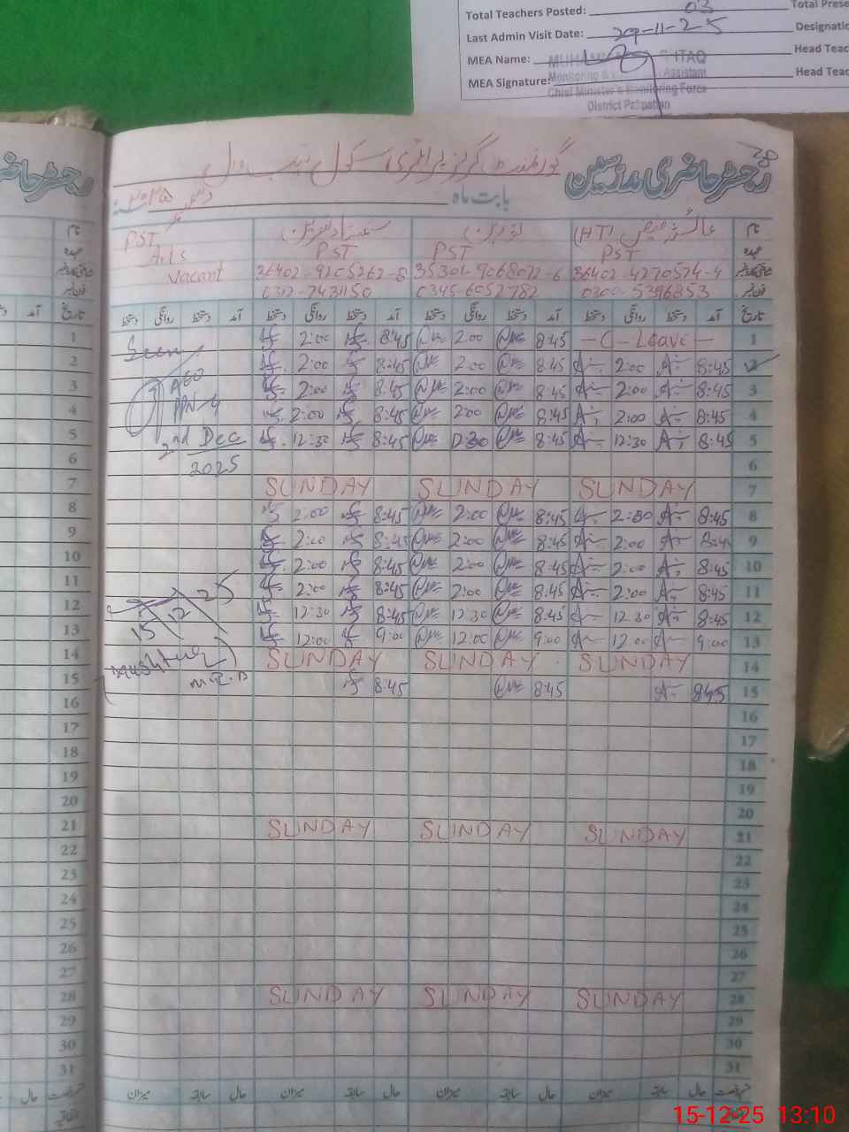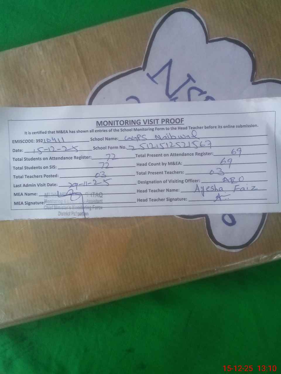 | Attendance Register | Head Teacher | MEA with School | Visit Proof |