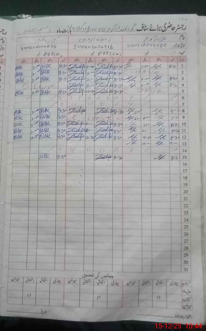 | CNIC | Full Name | Designation | R/C | Absence During Last Calender Month |