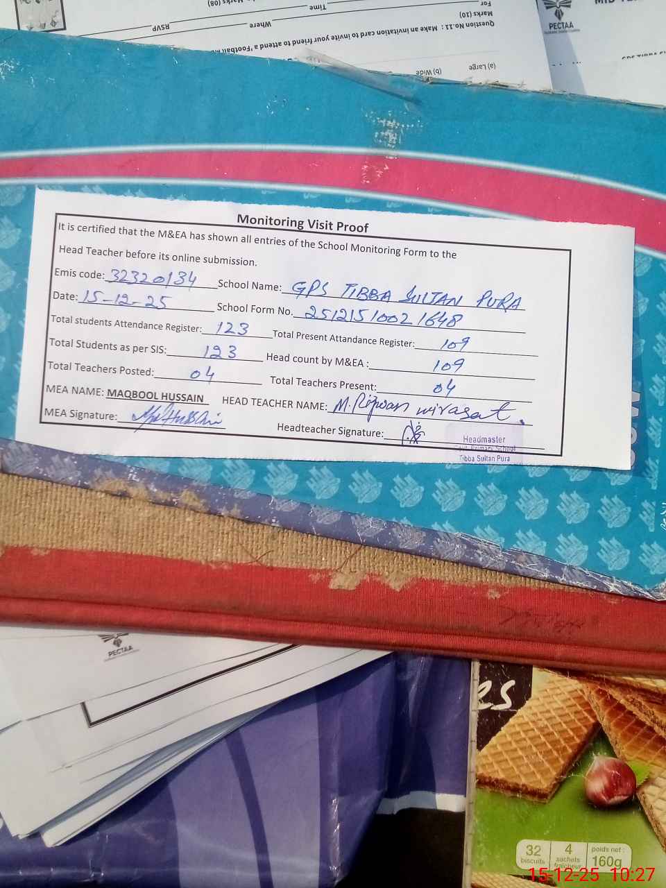| Attendance Register | Head Teacher | MEA with School | Visit Proof |
